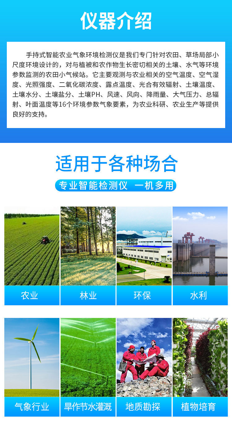 手持式智能農(nóng)業(yè)氣象環(huán)境檢測(cè)儀是我們專門針對(duì)農(nóng)田、草場(chǎng)局部小尺度環(huán)境設(shè)計(jì)的,對(duì)與植被和農(nóng)作物生長(zhǎng)密切相關(guān)的土壤、水氣等環(huán)境參數(shù)監(jiān)測(cè)的農(nóng)田小氣候站。它主要觀測(cè)與農(nóng)業(yè)相關(guān)的空氣溫度、空氣濕度、光照強(qiáng)度、二氧化碳濃度、露點(diǎn)溫度、光合有效輻射、土壤溫度、土壤濕度等8個(gè)環(huán)境參數(shù)氣象要素,為農(nóng)業(yè)科研、農(nóng)業(yè)生產(chǎn)等提供良好的支持。