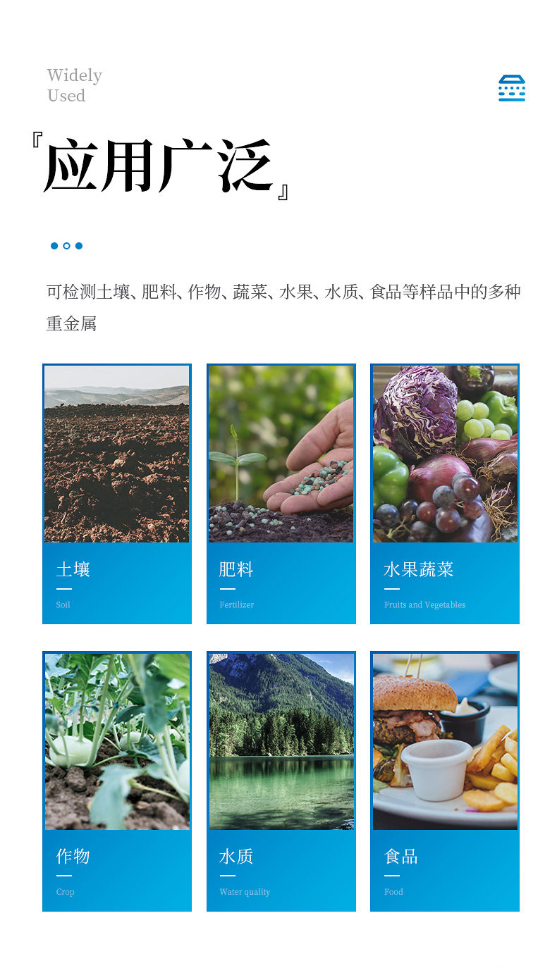 可對土壤、肥料、作物、蔬菜、水果、水質、食品等樣品中的砷、鉛、鎘、鉻、汞、鎳、鋁、氟、鈦、硒、鐵、鋁、鋅、錳、銅等進行快速聯合測定。